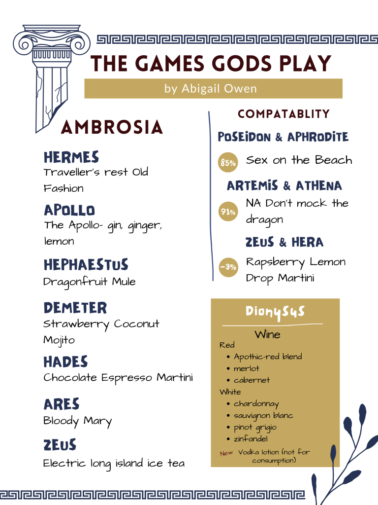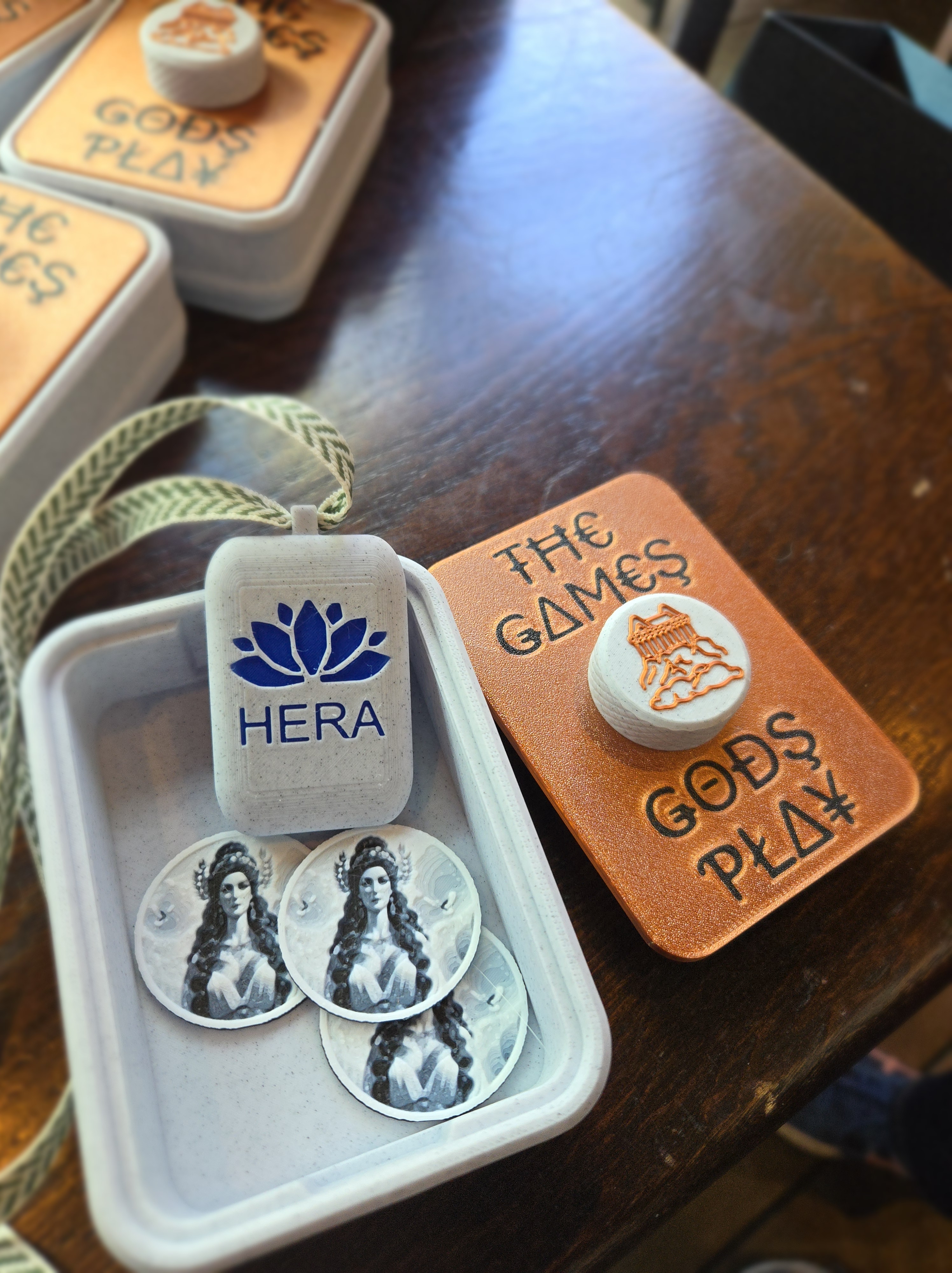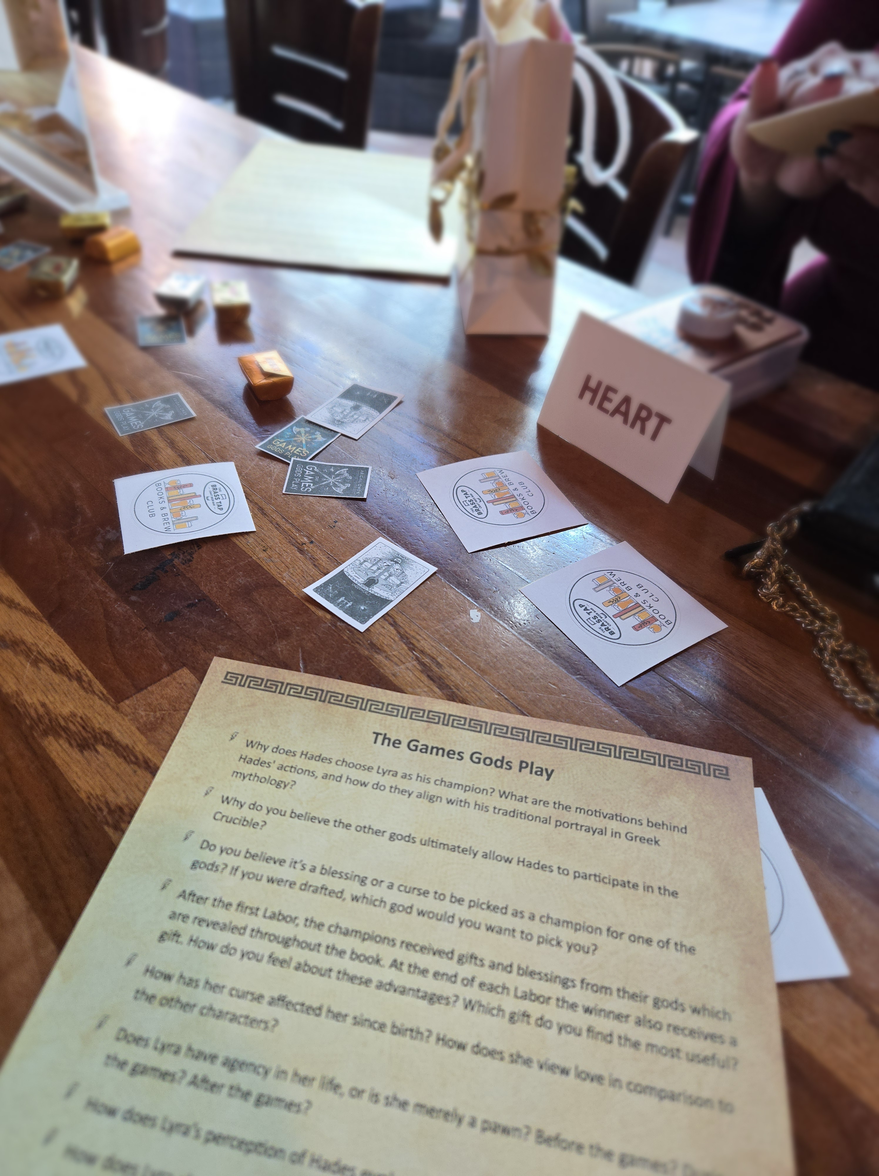 Thank you M & L for your fantastic contribution to this book club meeting with more wonderful 3D printed creations. This time they created a lock box that contained pendants with the name and symbol of each god/goddess and 3 coins with portraits of their heads which were fantastic!! They printed a 26 sided dice with the symbols of all the gods and the symbol of Mount Olympus that acted as a dealer’s choice option. They also made regular 6 sided dice with the words hit and miss on them. The dealer rolls the 26 sided dice twice to decide who plays against eachother and the players rolls the hit/miss dice. If one player rolls hit and the other rolls a miss the player who rolls a miss must give one of their coins to the player who rolled a hit. You repeat this process until one person remains with all the coins. To speed up this process at the meeting we had multiple duels happening at one in the form of rock paper scissor. The winner was gifted a 3D printed gold leaf crown and a trophy.