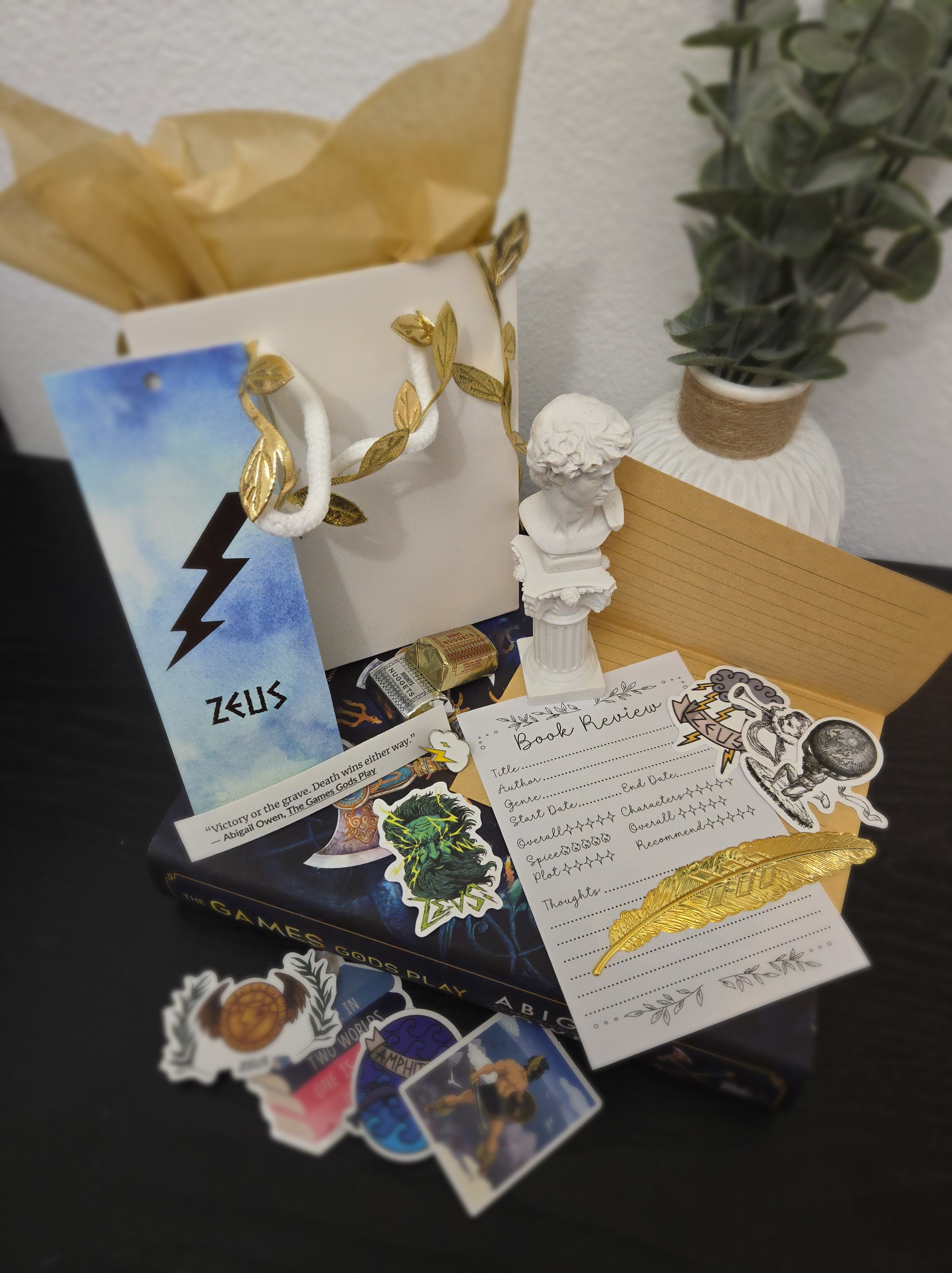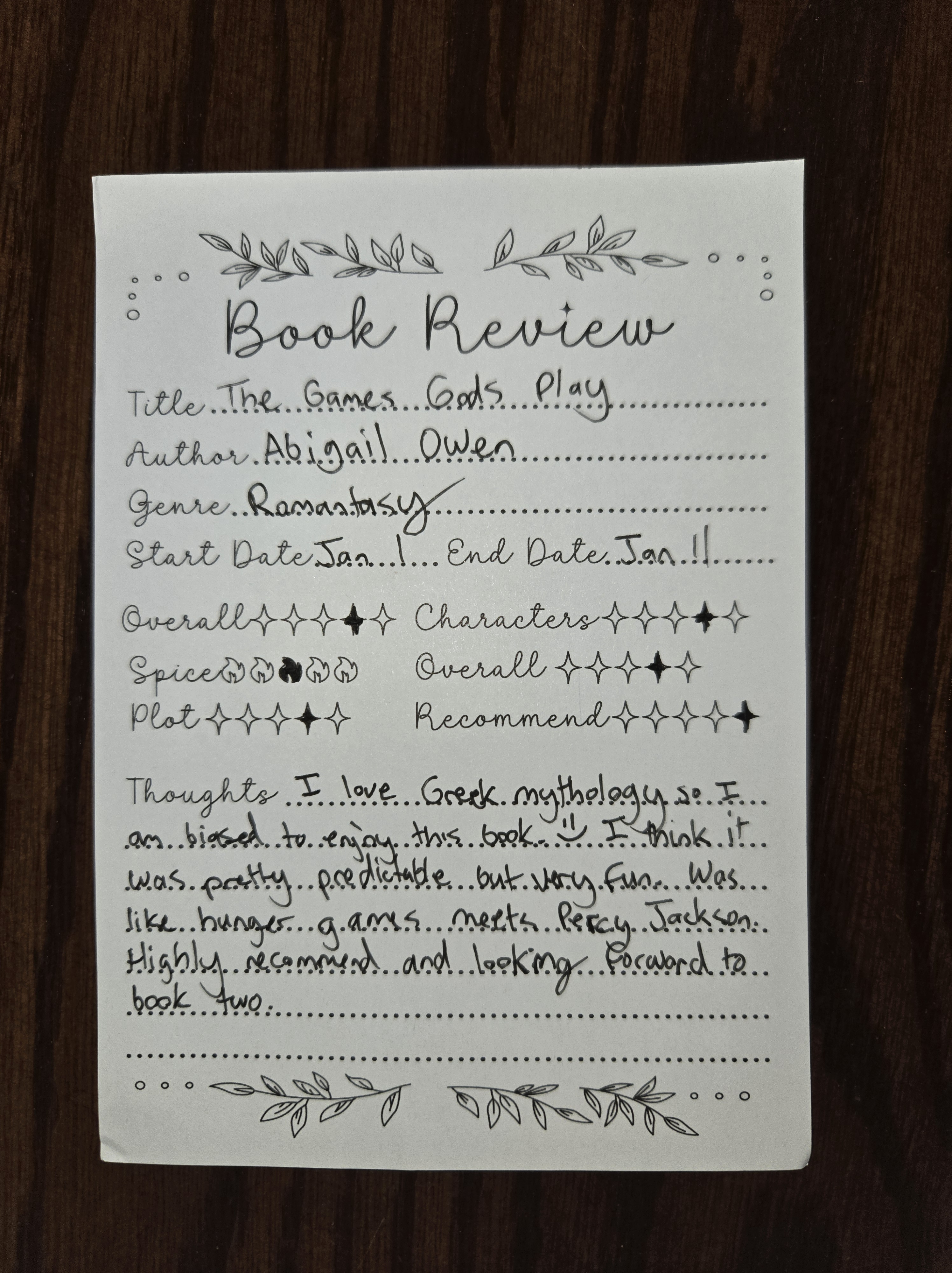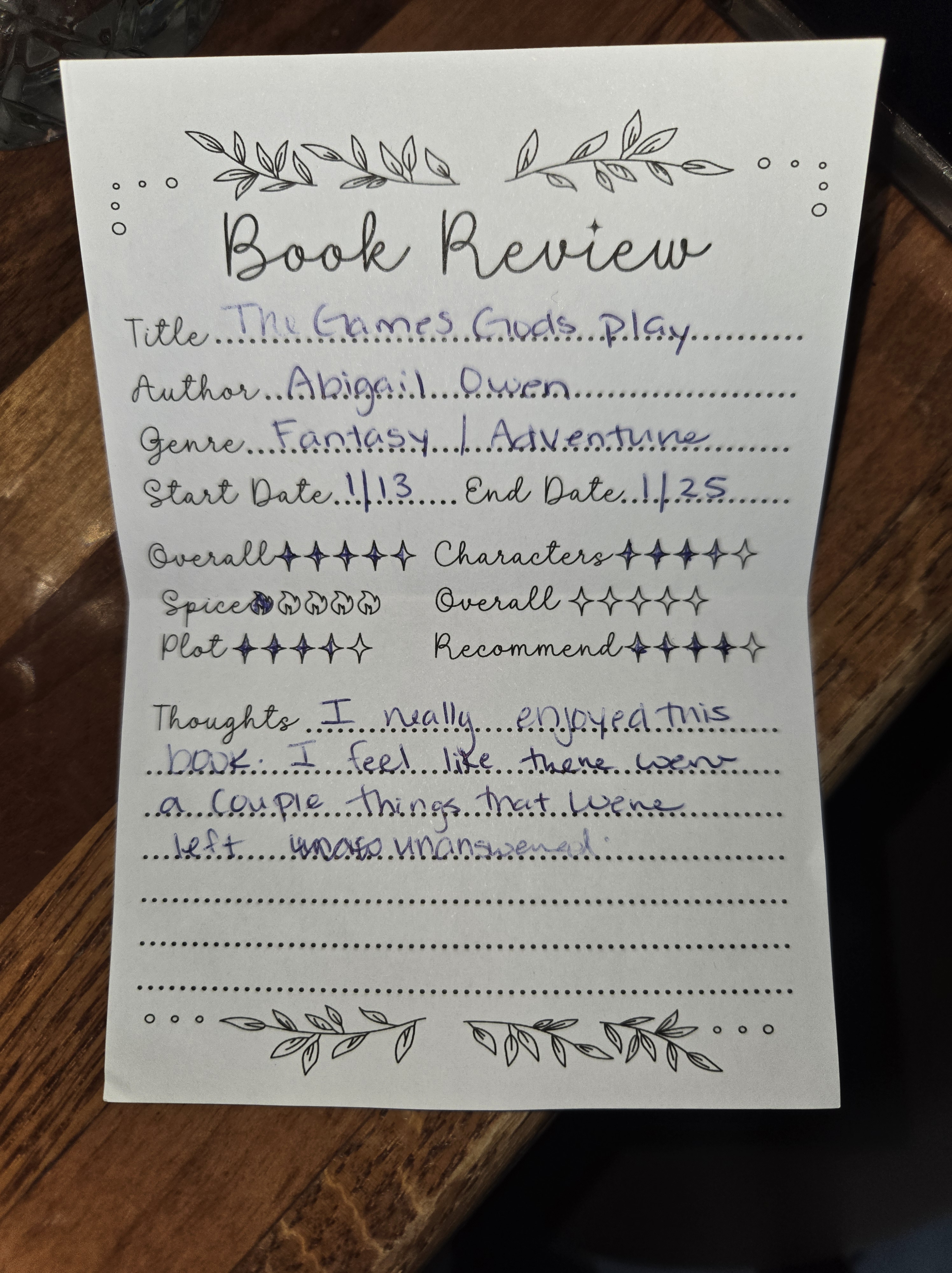 For the goodie bags, I made each bag feature a different god. Distinguishing which god each bag featured, I placed a bookmark sticking out with the name of the Greek god/goddess. Inside the bags I placed stickers associated with that god/goddess and other mythological gods/creatures. I also placed inside chocolates because Hades was described as being scented of bitter chocolate by Lyra. I also placed inside stickers of popular quotes from the book as well as metal feather shaped bookmarks. Inside the bags I placed folded pieces of paper. I had each member of the club fill out the paper with predictions for book 2 as we waited for all the other members to arrive. I placed all the predictions in a sealed envelope to be opened in October’s meeting. We have already decided to pick All the Games Gods Break as our book for that month! I recommend you do this for any other books your club reads that have a sequel coming out in the future. As previously shown, I also placed inside each bag a book review paper that was filled out alongside the predictions.