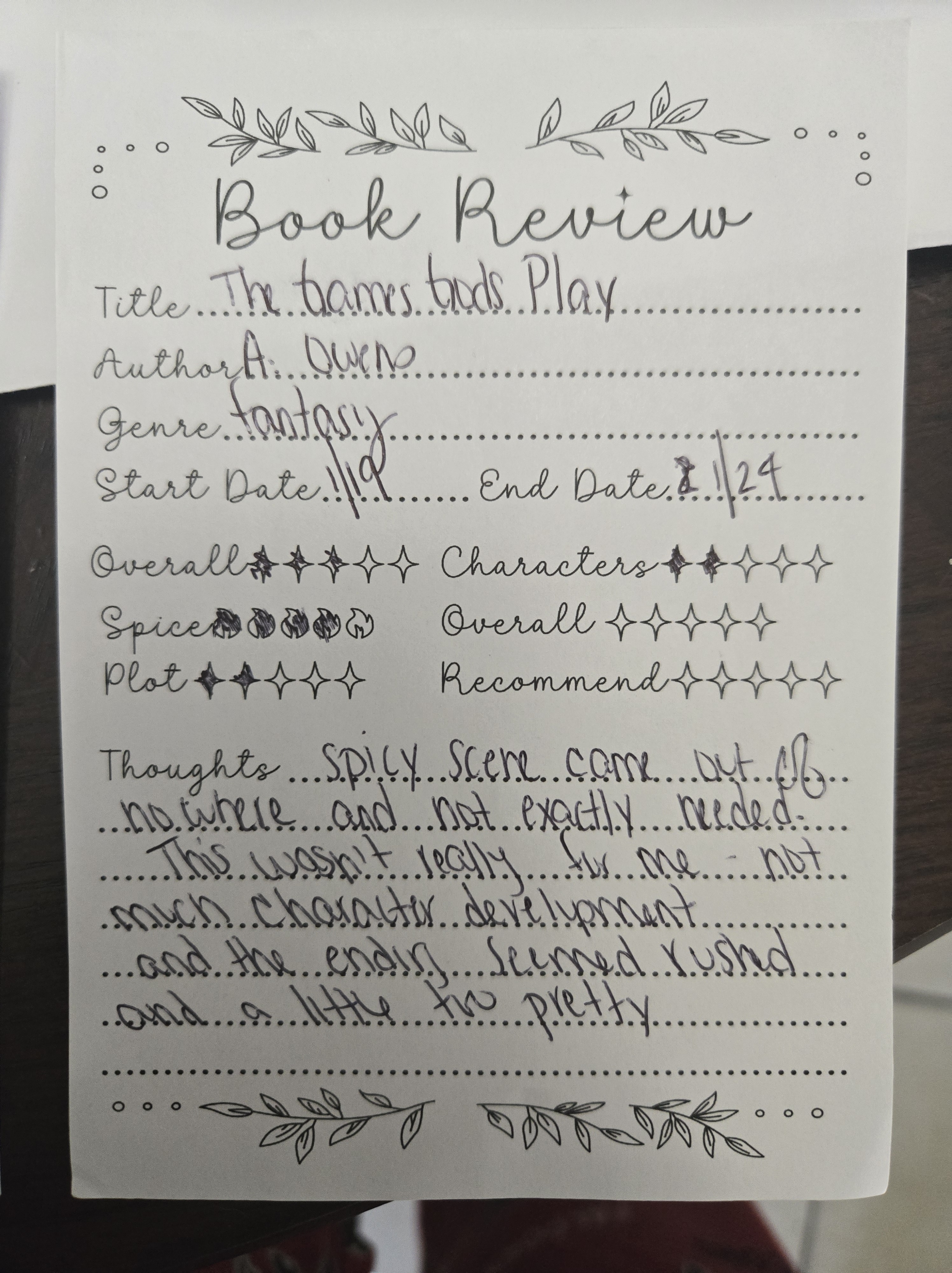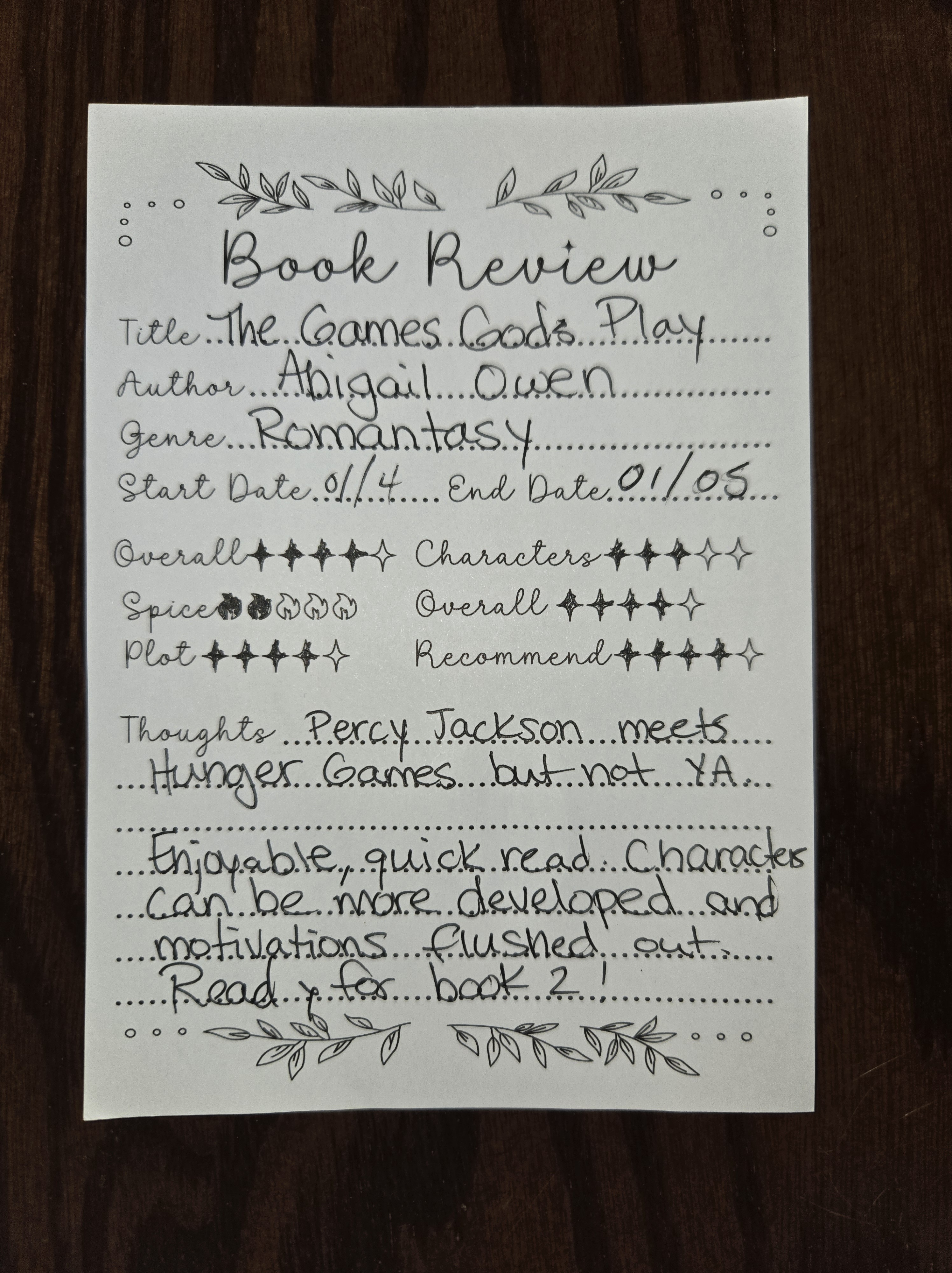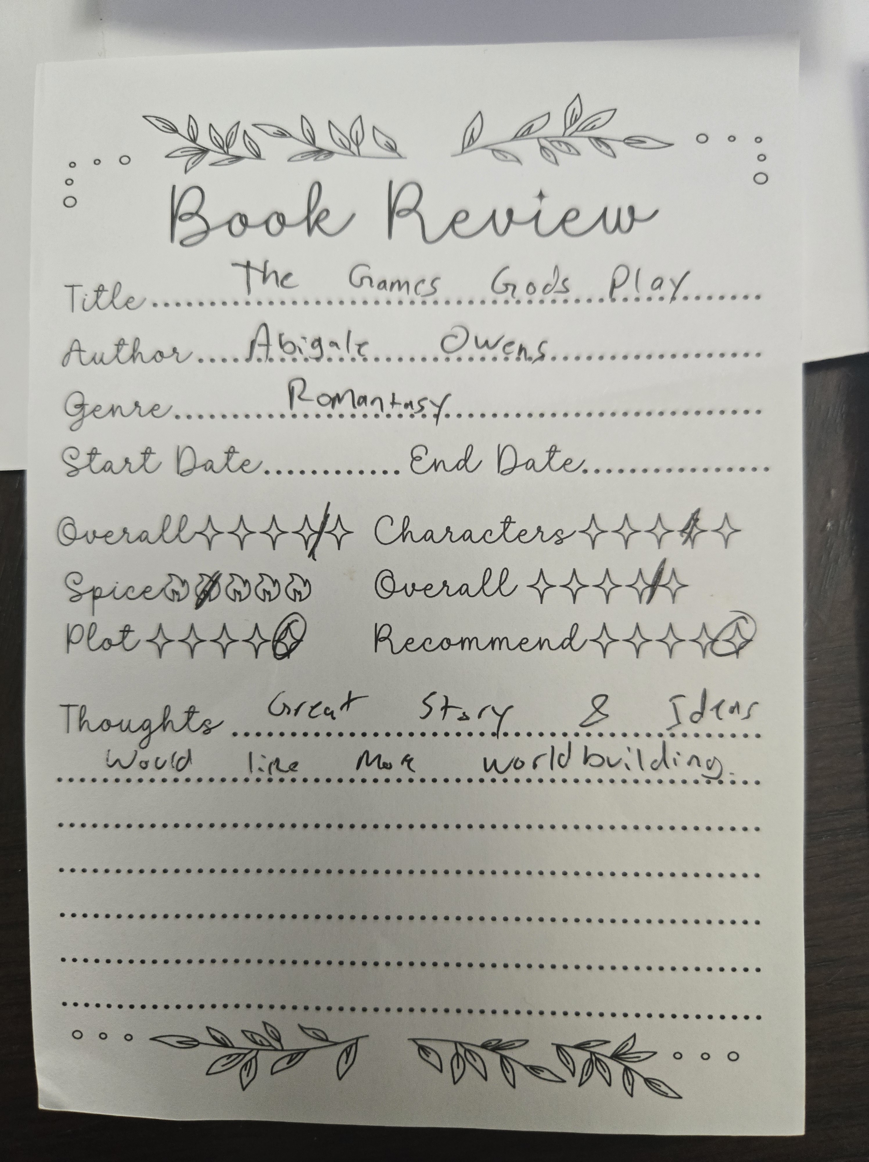 For the goodie bags, I made each bag feature a different god. Distinguishing which god each bag featured, I placed a bookmark sticking out with the name of the Greek god/goddess. Inside the bags I placed stickers associated with that god/goddess and other mythological gods/creatures. I also placed inside chocolates because Hades was described as being scented of bitter chocolate by Lyra. I also placed inside stickers of popular quotes from the book as well as metal feather shaped bookmarks. Inside the bags I placed folded pieces of paper. I had each member of the club fill out the paper with predictions for book 2 as we waited for all the other members to arrive. I placed all the predictions in a sealed envelope to be opened in October’s meeting. We have already decided to pick All the Games Gods Break as our book for that month! I recommend you do this for any other books your club reads that have a sequel coming out in the future. As previously shown, I also placed inside each bag a book review paper that was filled out alongside the predictions.