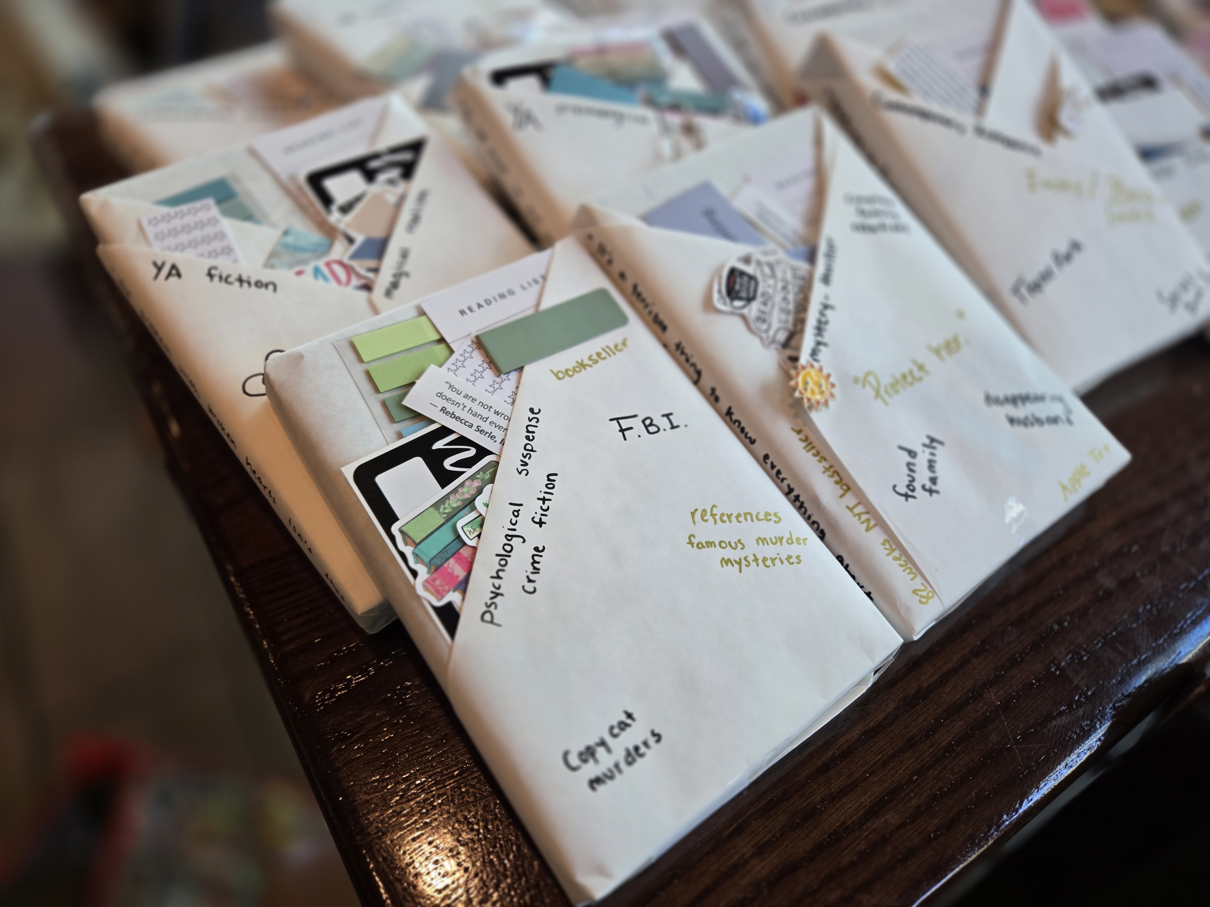 Since this was our first-year anniversary of doing the book club, I decided to do blind dates with a book as the goodies! It helped me clear out my shelf for new books and gave everyone a new book for their shelves. I also wanted to start doing a book exchange where people bring a book and leave with a book every month to help save our wallets and this gave everyone a starter book for that exchange! Inside the wrapping I put quotes from this month’s book, book tabs, stickers, enamel pins, bookmarks, rating stickers, reading lists, and name tags. The options are endless for the goodies you can place inside the wrapping!