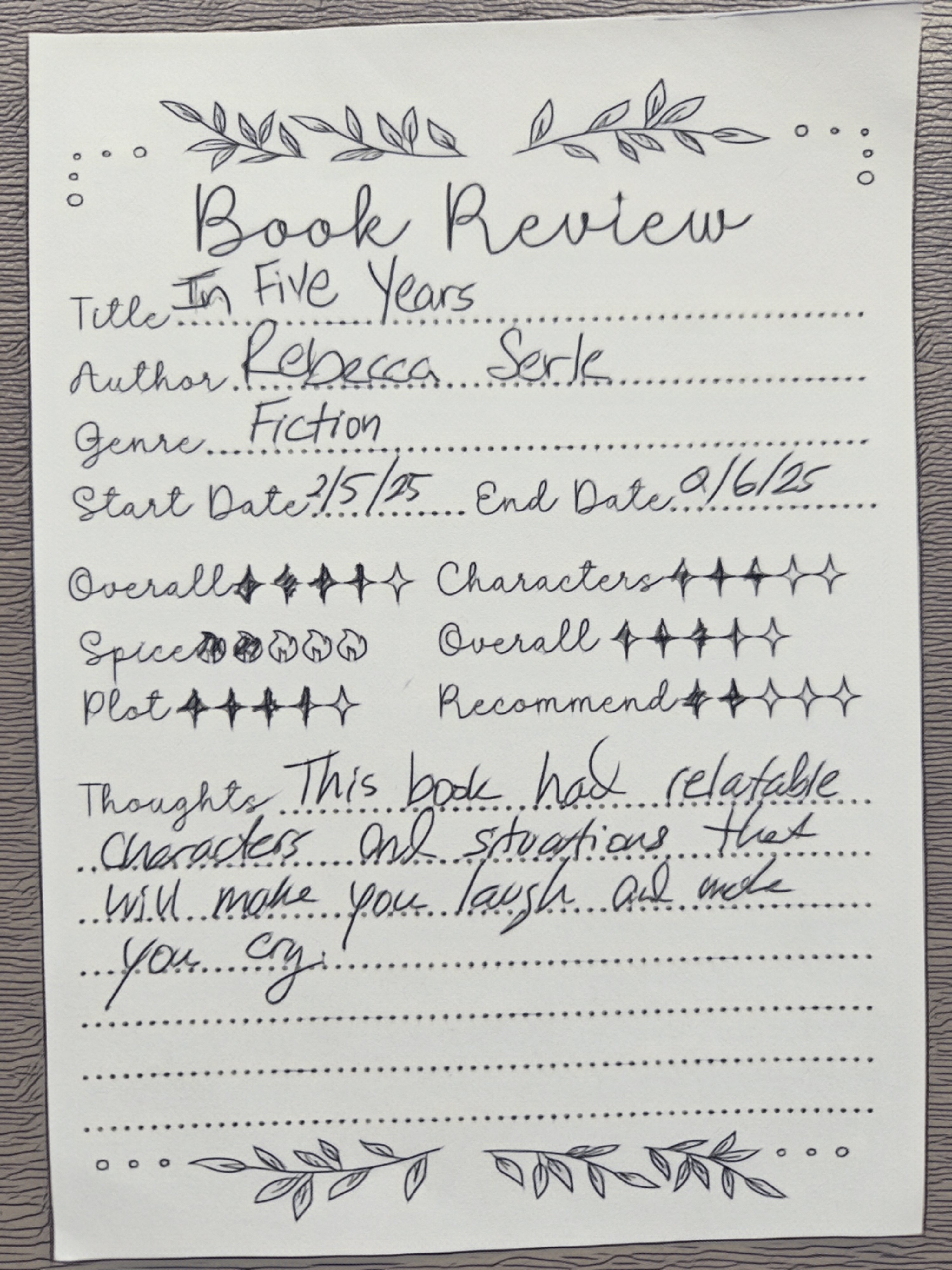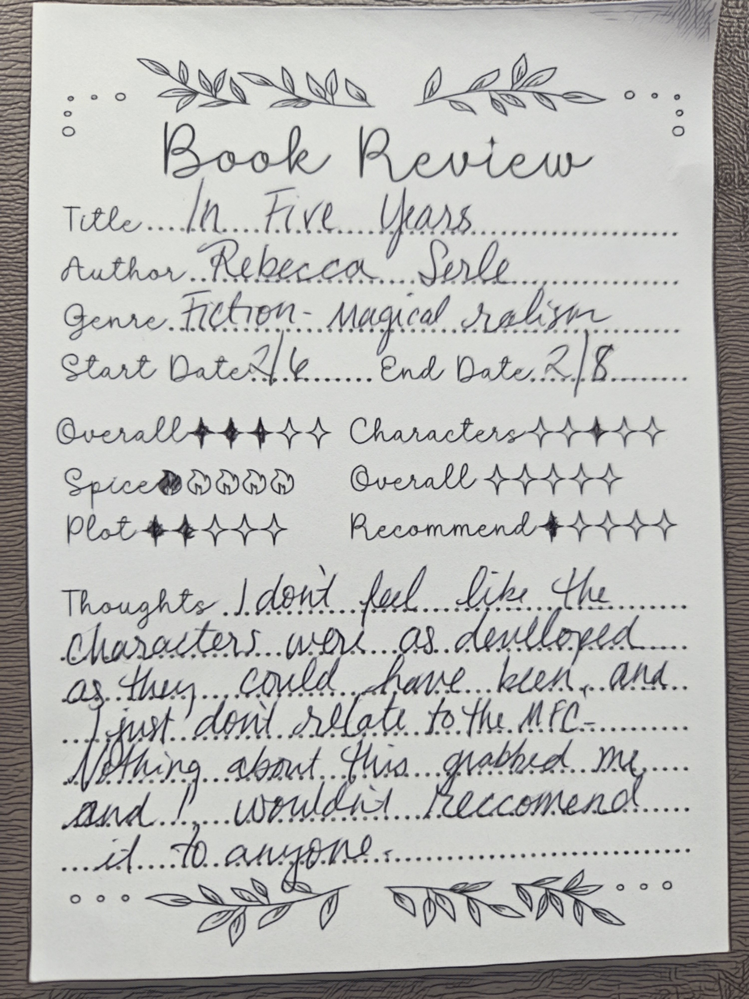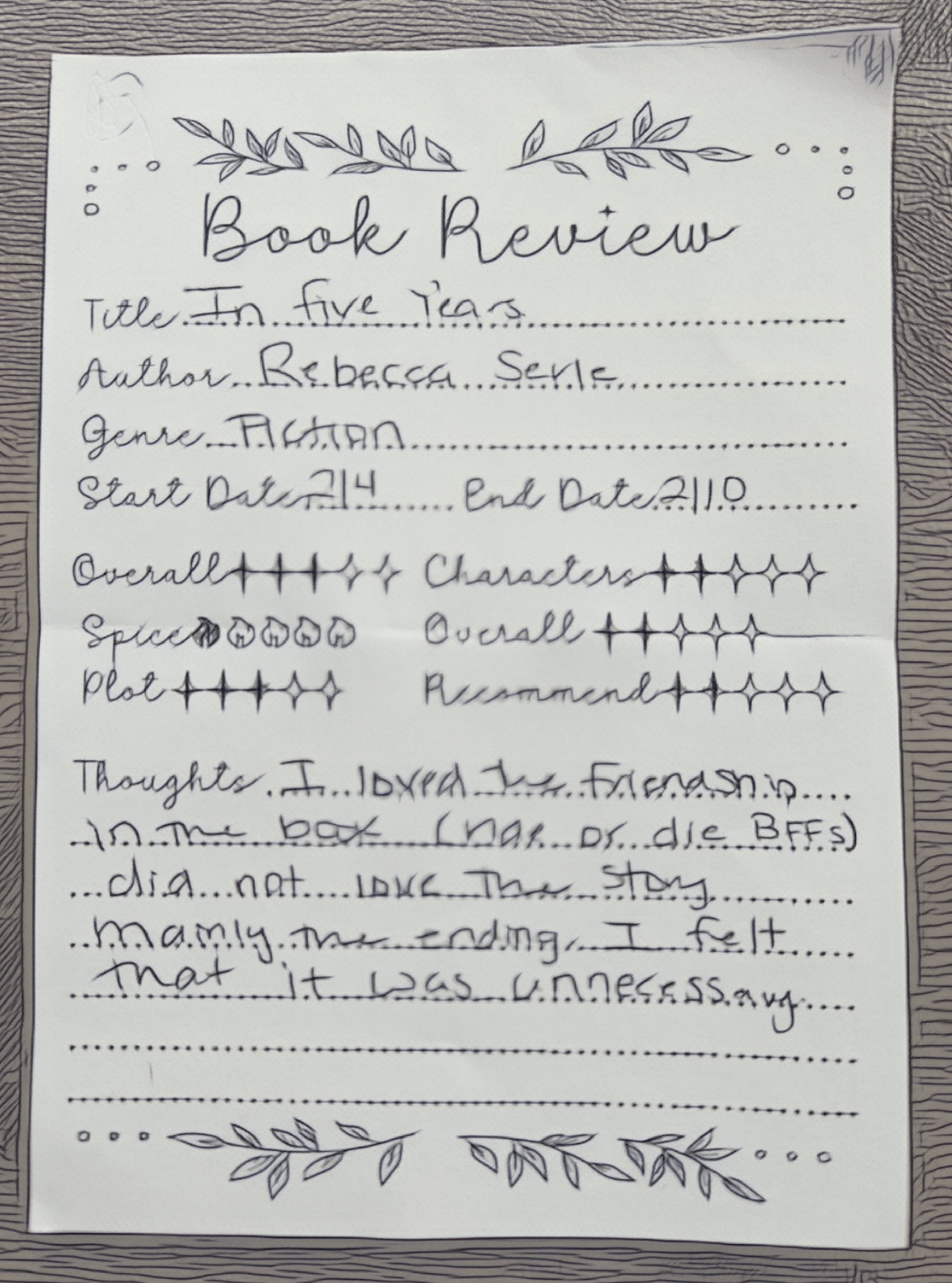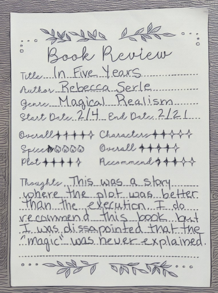 In Five Years was our primary book for this month and The Seven Year Slip was our second pick! The Seven Year Slip had a much more positive reaction!